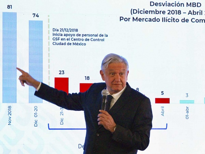 López Obrador resaltó que en los primeros días de abril el robo de combustible ha disminuido más, ya que tan sólo el pasado día 8 se reportaron sólo 5 mil barriles hurtados.