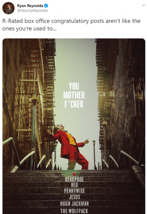 De hecho, el protagonista de “Deadpool”, Ryan Reynolds, felicitó por Twitter a la cinta que ha superado su récord con una foto del cartel de Joker en la que aparece Joaquín Phoenix como el villano de la franquicia de cómics de DC.