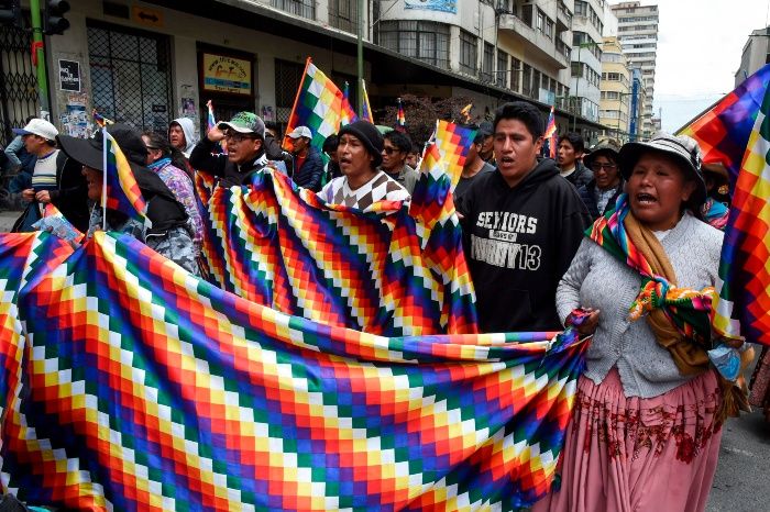 Los manifestantes, muchos llegados de El Alto, ciudad vecina habitada mayormente por migrantes, exigen la restitución de Morales al poder y el respeto a sus símbolos como la ‘whipala’, que representa a las nacionalidades indígenas y que fue irrespetada por policías en los días previos.