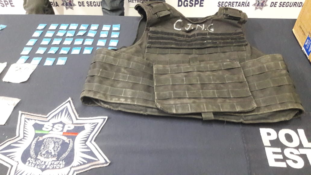 Se les decomisó un chaleco táctico y varias dosis de la droga, de la conocida como “cristal”, y despensas de artículos de primera necesidad con una etiqueta del CJNG.