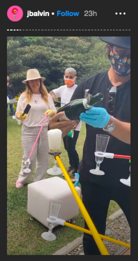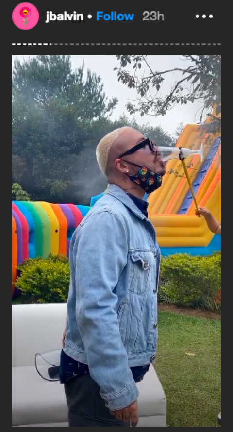 Balvin utilizaba una careta de plástico y mostraba a sus seguidores un enorme inflable, también de colores, toda vez que los invitados a la fiesta hacían uso de unos bastones para sostener sus copas, mientras que el cantante decía “social distance”, rodeado de carteles que decían “Feliz cumpleaños José (por José Álvaro Osorio Balvin)”.