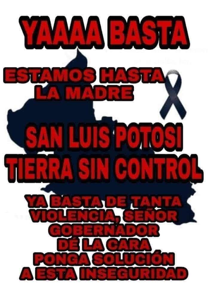 “Ya basta de tanta violencia, señor gobernador –Juan Manuel Carreras López- de la cara y ponga solución a esta inseguridad”, puesto que derivado al alza en los robos, la semana pasada se ejecutó a un funcionario de la Delegación de la Fiscalía General de la República en la capital potosina”, agregó en su publicación.