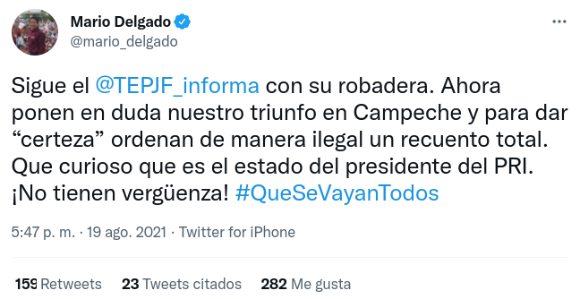 el dirigente nacional de Morena, Mario Delgado, acusó al TEPJF de seguir “con su robadera”, y rechazó el recuento total de la elección, calificando como “ilegal” la determinación de los magistrados electorales.