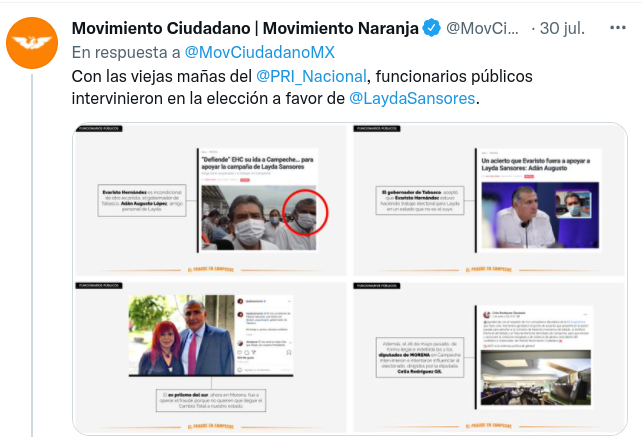 “Urnas infladas, boletas apócrifas, compra de votos y de credenciales, la participación indebida de funcionarios públicos de Tabasco, la sustitución del 70% de los funcionarios de casilla, condicionamiento de programas sociales y violencia son parte del fraude electoral que protagonizaron Morena y su candidata a la gubernatura de Campeche, Layda Sansores”, publicó Movimiento Ciudadano, a través de un comunicado.