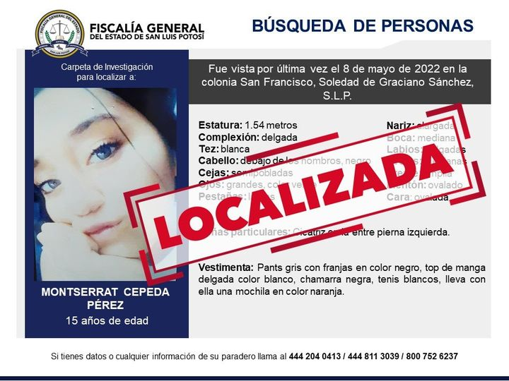 La Fiscalía General del Estado (FGE) dio con el paradero de una jovencita que tenía ficha de búsqueda en Soledad de Graciano Sánchez.
