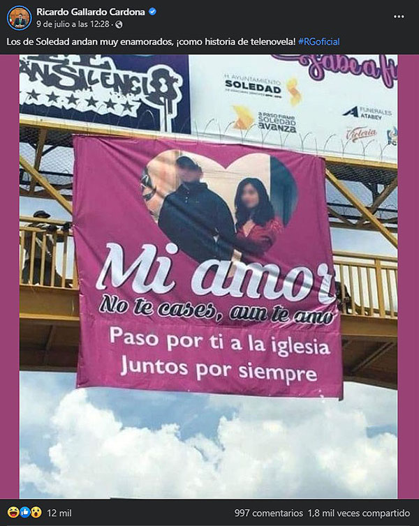 “Los de Soledad andan muy enamorados, ¡como historia de telenovela!”, escribió en Facebook para acompañar la foto de la manta colgada en un puente peatonal.