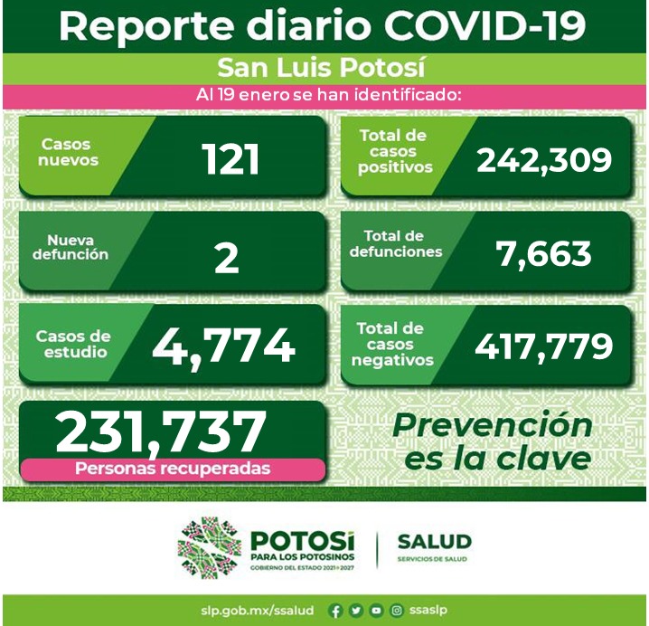 San Luis Potosí por segundo día consecutivo presentó dos defunciones por Covid-19 y 121 nuevos casos confirmados por laboratorio en el último día, para un acumulado de 242 mil 309 casos y 7 mil 663 muertes, de acuerdo al reporte técnico del Comité Estatal para la Seguridad en Salud.
