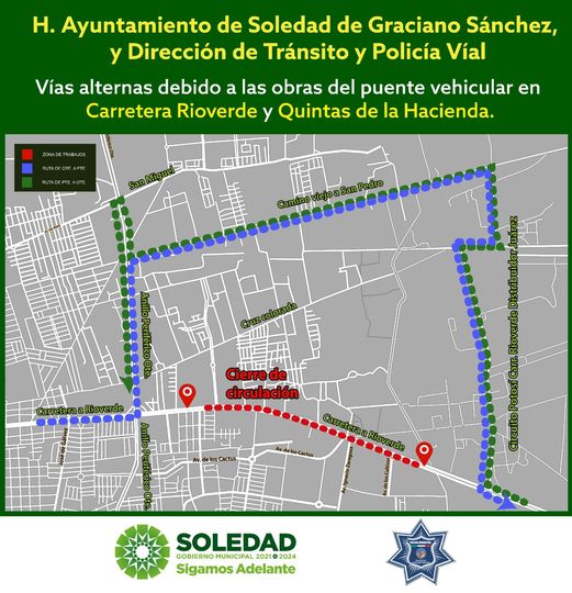Mientras que para circular hacia Rioverde, a partir de Periférico Oriente, se podrá tomar está ruta hasta Camino Viejo a San Pedro, y regresar por el Libramiento a Jassos, sobre Carretera Rioverde; el titular de la corporación vial añadió que para la población que vive en esa área del oriente del municipio, se les permitirá el paso, mientras que para las rutas del transporte público, podrán circular por las vías alternas mencionadas, con el debido acompañamiento y vigilancia de la autoridad.