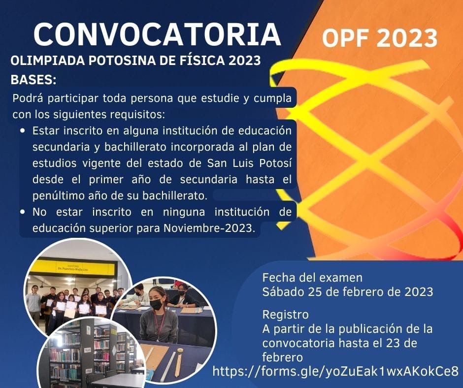 Pueden revisar la convocatoria, pueden acceder en la página de Facebook, @OlimpiadaPotosinadeFísica, o bien a través del link https://drive.google.com/…/1VsuH…/View. Para realizar el registro, éste se puede hacer en https://forms.gle/yoZuEak1wxAKokCE8. La fecha límite para inscribirse es el próximo 23 de febrero de 2023.