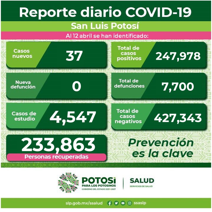 San Luis Potosí registró 37 nuevos casos de Covid-19 confirmados por laboratorio y sin defunciones en las últimas 24 horas, para un acumulado de 247 mil 978 casos y 7 mil 700 muertes, de acuerdo al reporte técnico del Comité Estatal para la Seguridad en Salud.