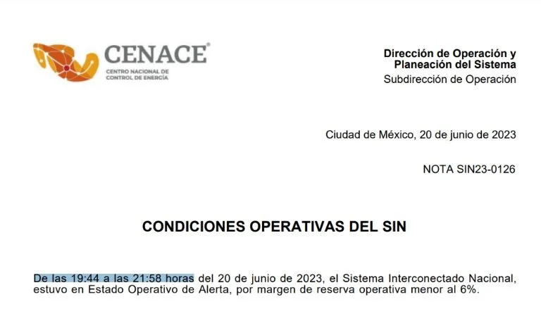 Las alta demanda de electricidad en el país por altas temperaturas de la ola de calor causó que el Sistema Interconectado Nacional estuviera en Estado Operativo de Alerta, por margen de reserva operativa menor al 6 por ciento, este martes 20 de junio, de las 19:44 a las 21:58 horas, según informó el Centro Nacional de Control de Energía (Cenace).