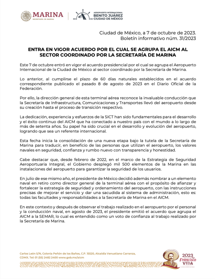 “Desde el 7 de octubre de 2023, el Aeropuerto Internacional Benito Juárez Ciudad de México quedó incorporado al sector coordinado por la Secretaría de Marina (Semar). Ello, al entrar en vigor el acuerdo presidencial publicado el 8 de agosto de 2023, en el Diario Oficial de la Federación (DOF)”, confirmó en un comunicado la autoridad aeroportuaria.