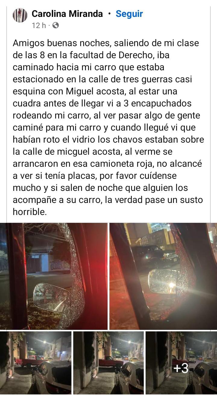 “Amigos buenas noches, saliendo de mi clase de las 8 en la facultad de Derecho, iba caminado hacia mi carro que estaba estacionado en la calle de Tres Guerras casi esquina con Miguel Acosta, al estar una cuadra antes de llegar vi a 3 encapuchados rodeando mi carro, al ver pasar algo de gente caminé para mi carro y cuando llegué vi que habían roto el vidrio, los chavos estaban sobre la calle de Miguel Acosta, al verme se arrancaron en esa camioneta roja, no alcancé a ver si tenía placas, por favor cuídense mucho y si salen de noche que alguien los acompañe a su carro, la verdad pase un susto horrible”, público en su redes sociales.