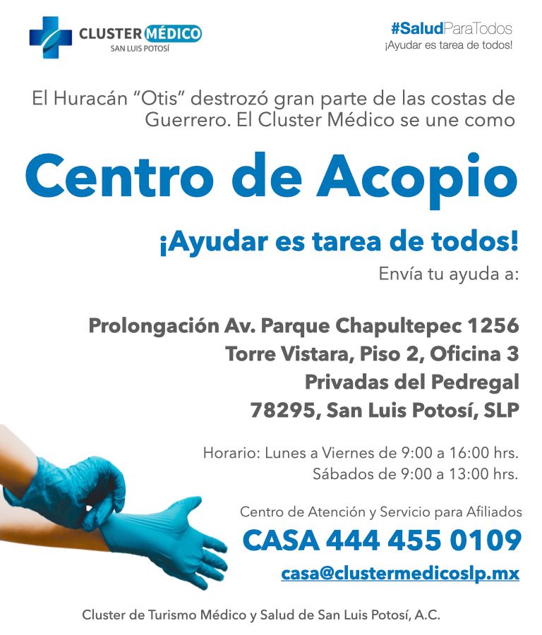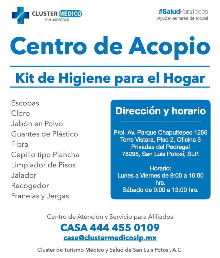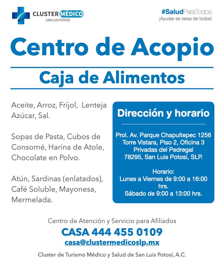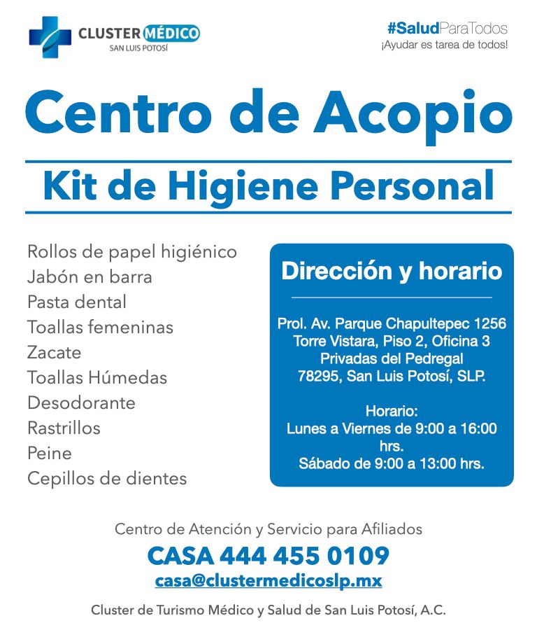 El Clúster Médico y el Colegio de la Profesión Médica de San Luis Potosí instalaron un centro de acopio en sus oficinas del exclusivo fraccionamiento Privadas del Pedregal, donde reciben en donativo por parte de la población del sur poniente de la capital potosina kits de higiene personal, cajas con alimentos no perecederos y kits de higiene para el hogar.