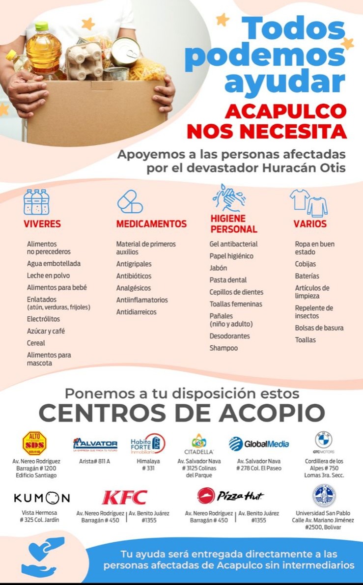 El Clúster Médico y el Colegio de la Profesión Médica de San Luis Potosí instalaron un centro de acopio en sus oficinas del exclusivo fraccionamiento Privadas del Pedregal, donde reciben en donativo por parte de la población del sur poniente de la capital potosina kits de higiene personal, cajas con alimentos no perecederos y kits de higiene para el hogar.