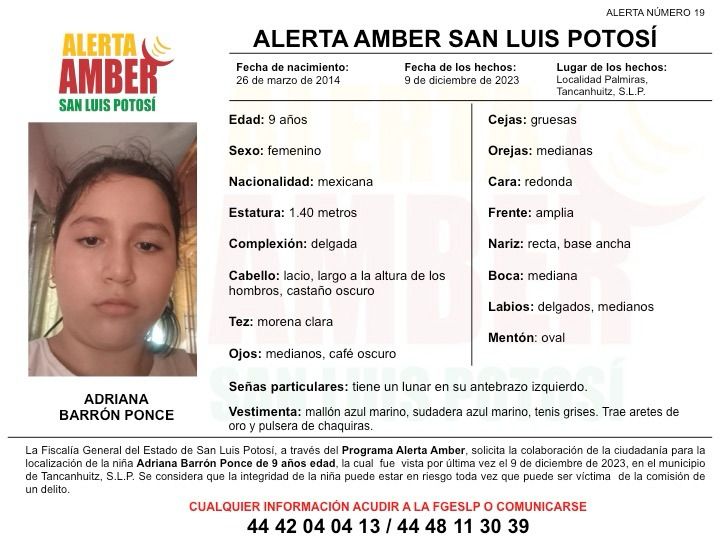 La Fiscalía General del Estado de San Luis Potosí (FGESLP) activó una Alerta Amber para localizar a Adriana Barrón Ponce, una niña de 9 años de edad en el municipio de Tancanhuitz.