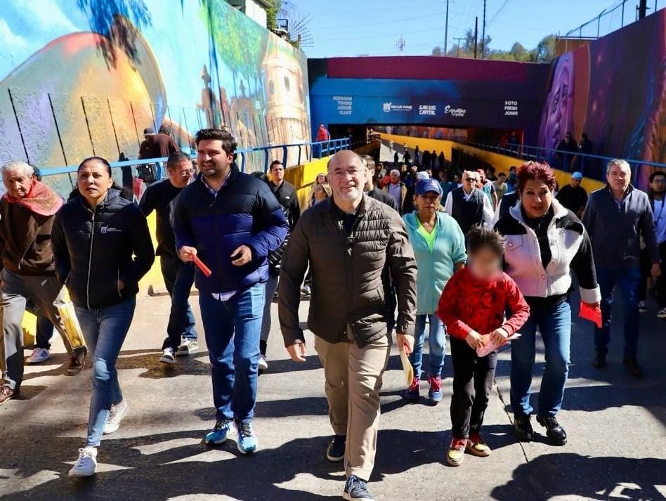 El Alcalde Enrique Galindo Ceballos encabezó la inauguración del nuevo mural en el puente Manuel José Othón, que forma parte de las acciones del Gobierno de la Capital para embellecer uno de los accesos principales al Centro Histórico de la Capital, mediante una obra que representa a la Procesión del Silencio, la llegada del ferrocarril a San Luis Potosí y La Caja del Agua.