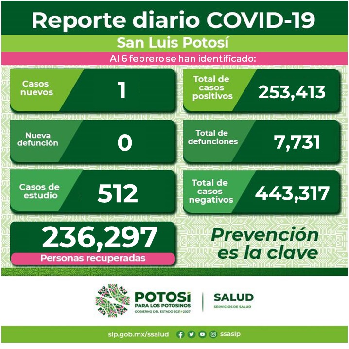 El nuevo caso corresponde a una mujer de 17 años de edad, la cual no tenía su esquema completo de vacunación contra el Coronavirus y es residente de la zona metropolitana de San Luis Potosí (1), el resto del estado sin virus.