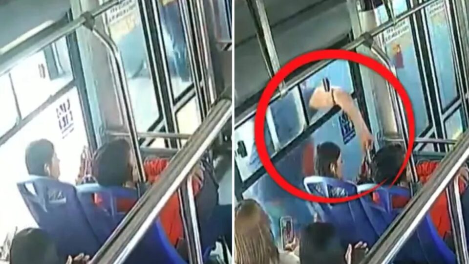 El inicio del recorrido de la unidad similar al Metrobús es lento, por lo que en instantes el sujeto ingresa un brazo por la ventanilla cercana a la víctima y le arrebata el celular.
