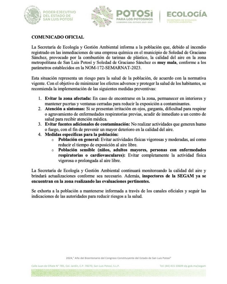 La Secretaría de Ecología y Gestión Ambiental ha informado que debido al incendio registrado en las inmediaciones de una empresa química en el municipio de Soledad de Graciano Sánchez, provocado por la combustión de tarimas de plástico, la calidad del aire en la zona metropolitana de San Luis Potosí y Soledad se ha visto gravemente afectada.