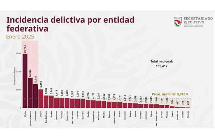 Según los datos del reporte mensual, la entidad potosina registró un total de 5 mil 085 carpetas de investigación relacionadas con diversas modalidades de delito, lo que implica un incremento anual del cinco por ciento con respecto al total registrado en enero del 2024, que fueron cuatro mil 859. La diferencia absoluta fue de 226 delitos más.