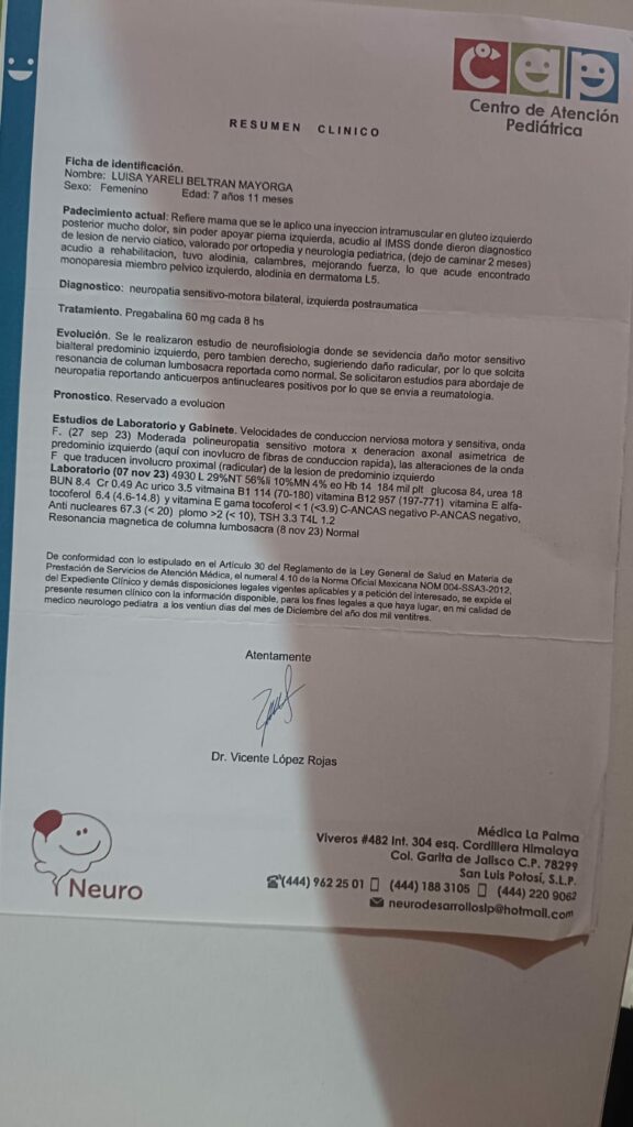 Luisa Yareli, de apenas 9 años de edad, lleva más de dos años sufriendo de neuropatía periférica izquierda, a causa de una inyección mal aplicada en la Nueva Farmacia Salk pic.twitter.com/bwlXFxmtUC