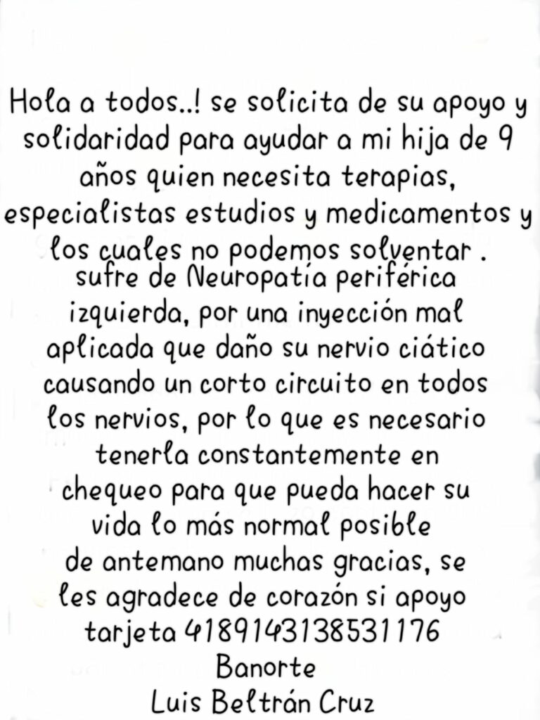 Luis pide apoyo para poder seguir tratando a su hija Luisa Yareli, quien requiere de tratamiento hasta los 18 años, las donaciones se pueden realizar a la tarjeta 4189 1431 3853 1176 de Banorte a nombre de Luis Beltrán Cruz.