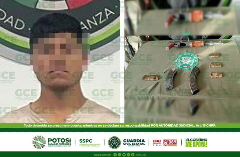 La aplicación del Plan Integral de Seguridad en el Altiplano potosino por parte de la Guardia Civil Estatal, en coordinación con el Ejército mexicano y la Guardia Nacional, permitió la detención de un hombre armado con un fusil de asalto, cargadores, cartuchos y equipo táctico.