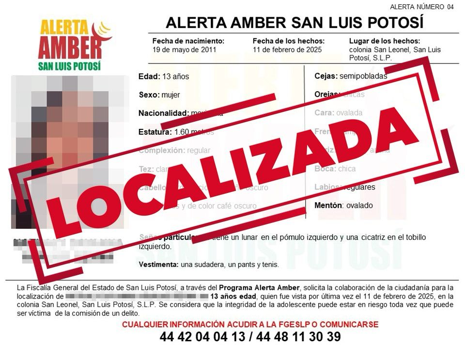 La Fiscalía General del Estado de San Luis Potosí (FGESLP) informa la localización de una adolescente de 13 años, por lo que se desactivó una Alerta Amber que se había iniciado hace unas horas.