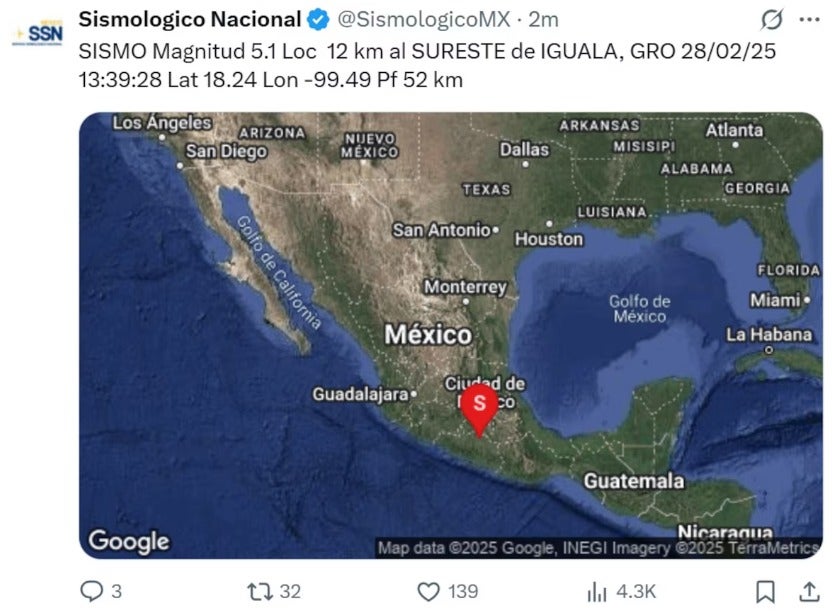 La presidenta Claudia Sheinbaum Pardo informó que no se registraron daños en el país luego del sismo de magnitud 5.1 ocurrido al sureste de Iguala, Guerrero, el cual fue perceptible en diversas regiones, incluida la Ciudad de México.