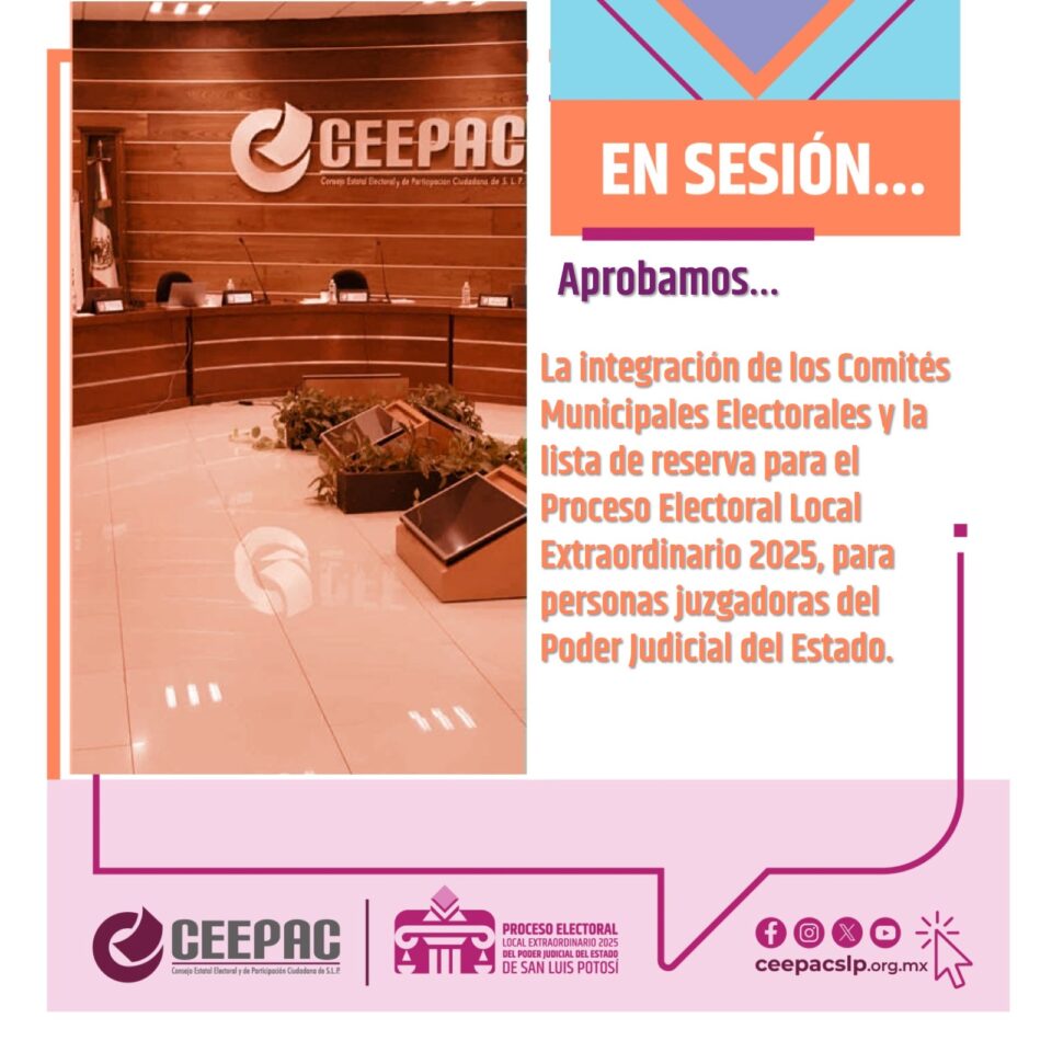 El Consejo Estatal Electoral y de Participación Ciudadana (CEEPAC) aprobó en sesión extraordinaria del 1 de marzo, la integración de sus Comités Municipales Electorales y la lista de reserva para el Proceso Electoral Local Extraordinario 2025, para personas juzgadoras del Poder Judicial del Estado.