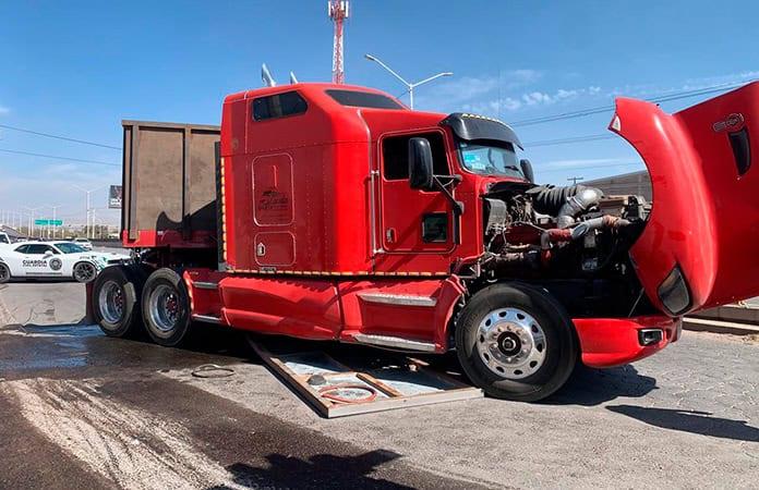 Fue poco después de las dos de la tarde de este jueves, cuando el tráiler color rojo con remolque tipo plataforma, se desplazaba por la lateral del Periférico Norte y al llegar al puente de la Avenida del Sauce, repentinamente la estructura metálica cedió desde la base cayéndole encima de la cabina.