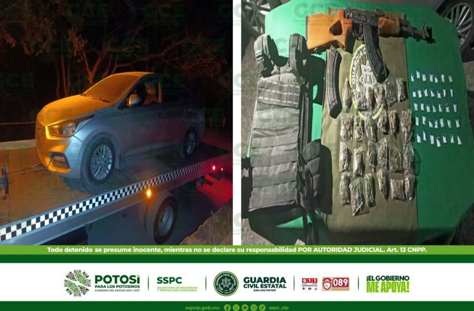 Aseguran vehículo con fusil, drogas y equipo táctico en la Huasteca