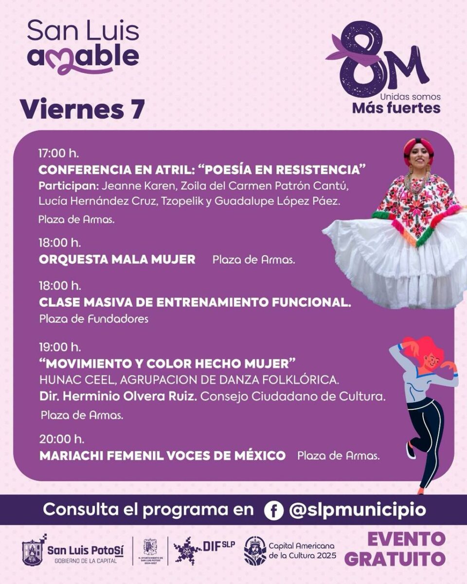 Estas actividades no solo celebran la contribución de las mujeres en la cultura, sino que también promueven un espacio para el empoderamiento y el reconocimiento de la riqueza cultural de nuestra comunidad. Para conocer más detalles sobre esta programación, le invitamos a visitar la página de Facebook de Cultura Municipal SLP donde podrá consultar el programa completo de actividades.