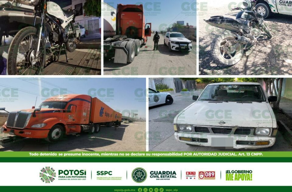 Una motocicleta Vento modelo 2021 color negro, robada en Chimalhuacán, Estado de México fue recuperada en la localidad de Vallejo en el municipio de Villa de Guadalupe; una camioneta Nissan color blanco, modelo 2001, con reporte de robo en la zona centro de la capital potosina, fue recuperada en la colonia El Paseo.