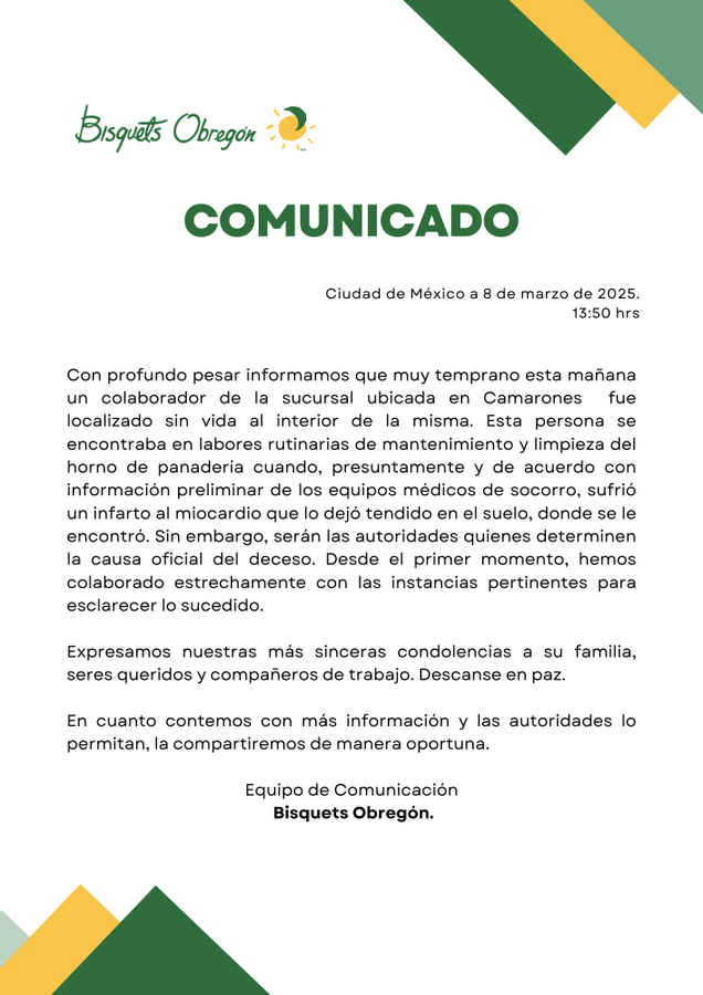 La cadena de Bisquets Obregón informó que el trabajador realizaba labores de mantenimiento y habría sufrido un infarto mientras limpiaba el horno.