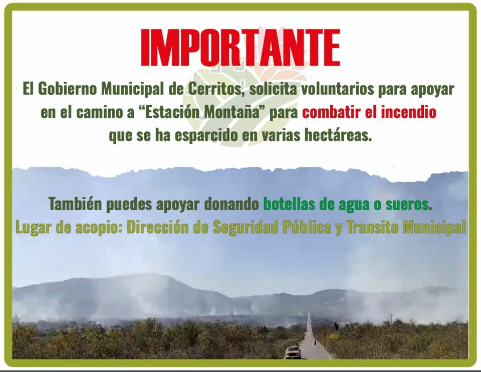 Por medio de redes sociales el Ayuntamiento del municipio de Cerritos, solicitó voluntarios para combatir el incendio en el camino a “Estación montaña” de dicha localidad, el cual menciona que se ha esparcido por varias hectáreas.