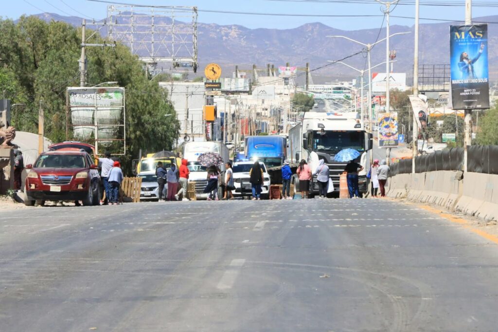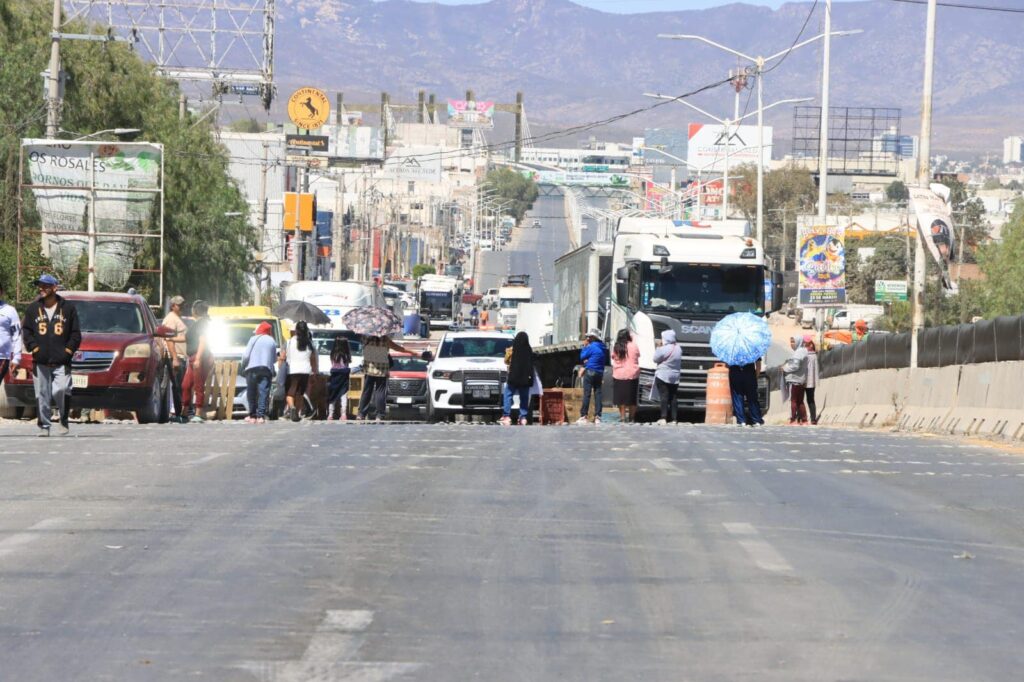 Habitantes de las colonias Peñasquito, Cañada de Lobo y San Juan de Guadalupe mantienen un bloqueo en el Circuito Potosí en ambos sentidos, a la altura de la Cañada de Lobo, en protesta por supuesta falta de agua en sus comunidades.