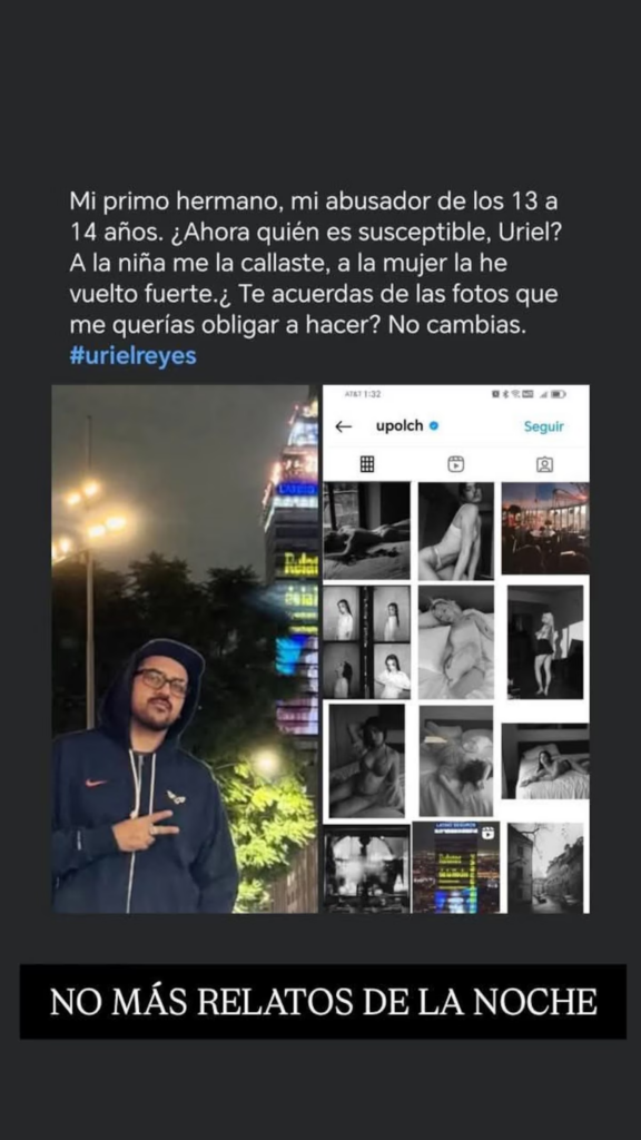“Mi primo hermano, mi abusador de los 13 a 14 años. ¿Ahora quién es susceptible, Uriel Reyes Lerma? A la niña me la callaste, a la mujer la he vuelto fuerte. ¿Te acuerdas de las fotos que me querías obligar a hacer? No cambias”. El mensaje fue acompañado por una imagen del creador de contenido y capturas del perfil de Instagram de Uriel Reyes, donde se observan fotografías de mujeres desnudas, lo que generó múltiples cuestionamientos entre usuarios sobre la conducta del youtuber.