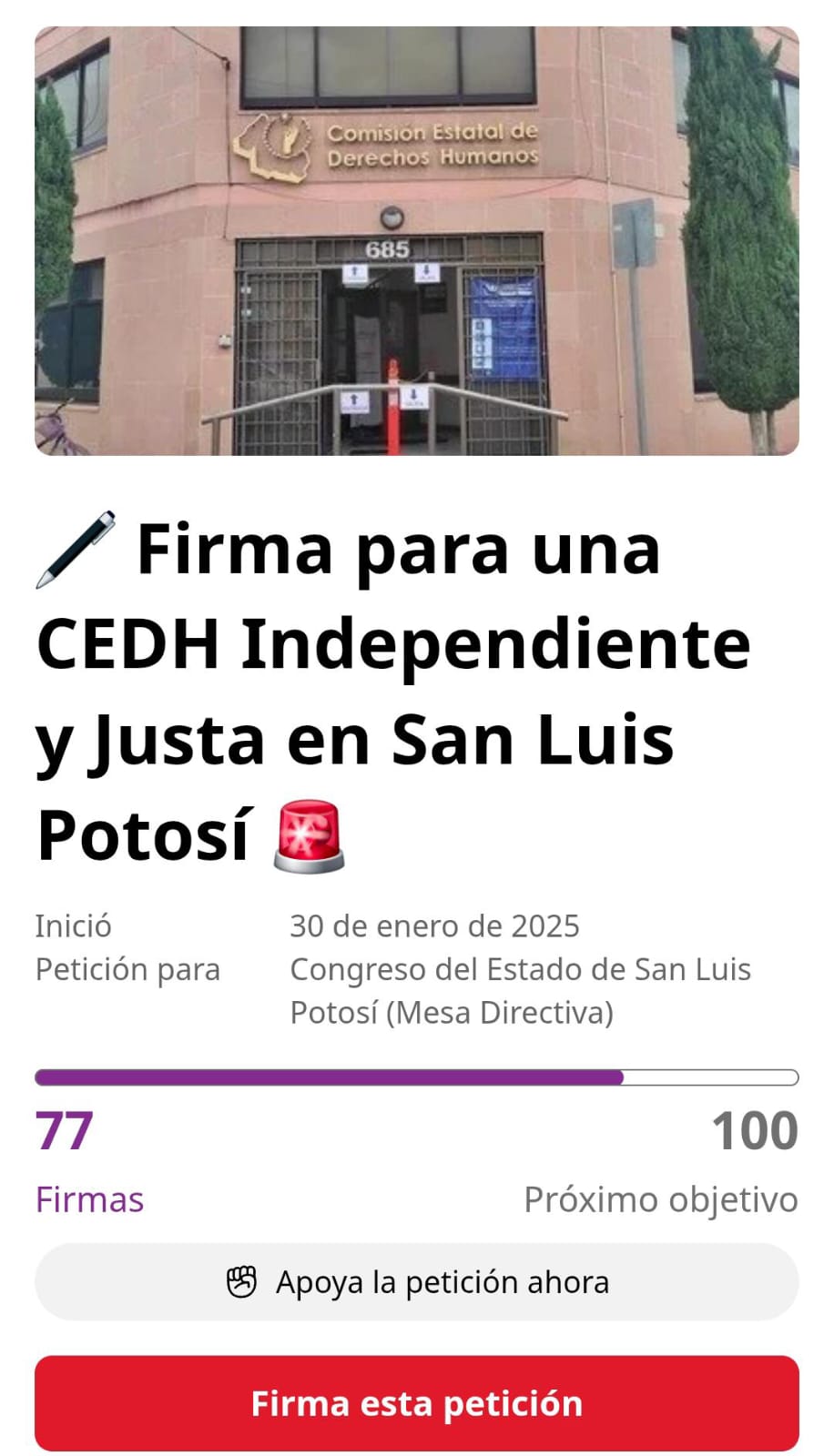 Por ello, pidió el respaldo para demostrar que la ciudadanía exige una CEDH justa, transparente y cercana a la gente, se puede firmar en el siguiente link. https://www.change.org/p/%EF%B8%8F-firma-para-una-cedh-independiente-y-justa-en-san-luis-potosí?recruiter=19835747&recruited_by_id=fee7e1d0-cf13-012f-0cc4-4040b09128dc&utm_source=share_petition&utm_campaign=share_petition&utm_medium=copylink&utm_content=cl_sharecopy_490401396_es-419%3A0