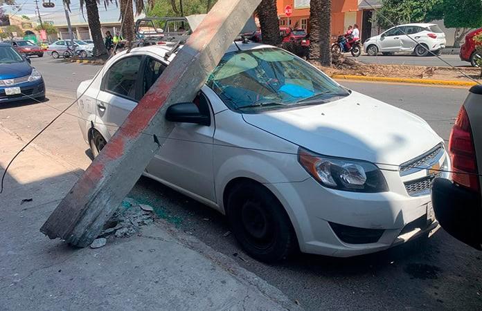 Fue a la altura del número 1010, entre las calles de Gonzalo Curiel y Juegos Olímpicos, en donde el camión con carga tocó los cables de luz y los tensó a tal grado de que el poste de concreto que los sujetaba se desprendió desde la base y cayó encima a un automóvil Chevrolet Aveo color blanco, el cual se encontraba estacionado junto a la banqueta.