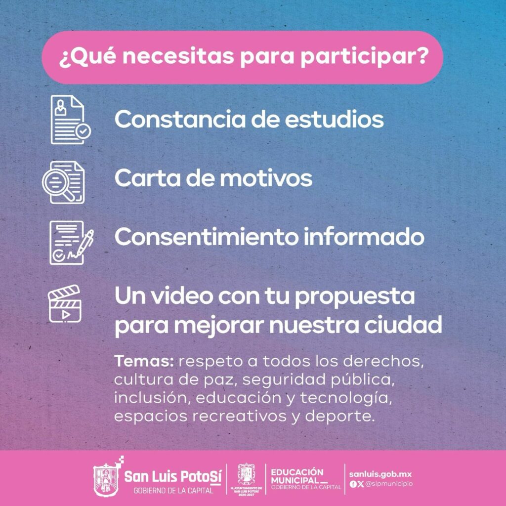 La Comisión de Educación Pública y Bibliotecas recordó que a través del siguiente enlace, las y los menores podrán analizar íntegra la convocatoria: https://sitio.sanluis.gob.mx, ubicada en la parte inferior de este sitio, aunque entre los requisitos sobresalen: constancia de estudios, carta de motivos por los que desea ser parte de este órgano municipal, consentimiento informado de la madre, padre o persona tutora, además de entregar un video con propuesta para mejorar la ciudad.