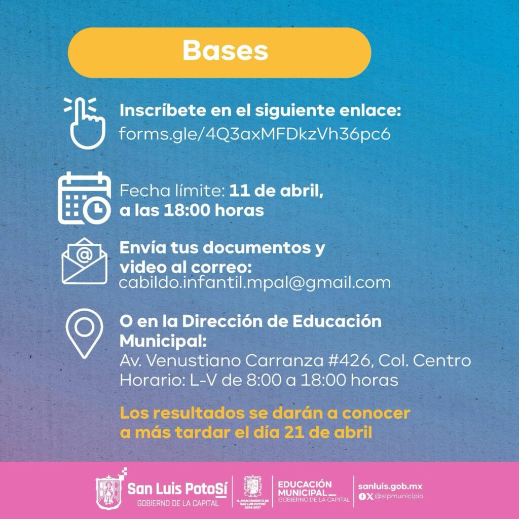Igualmente, las alumnas y alumnos que deseen participar en el proceso de selección para conformar el Cabildo Infantil 2025, deberán realizar su inscripción a través del formulario de la siguiente liga: https://forms.gle/4Q3axMFDkzVh36pc6 Los resultados de las personas seleccionadas se darán a conocer a más tardar el 21 de abril en los medios oficiales del Ayuntamiento de San Luis Potosí.