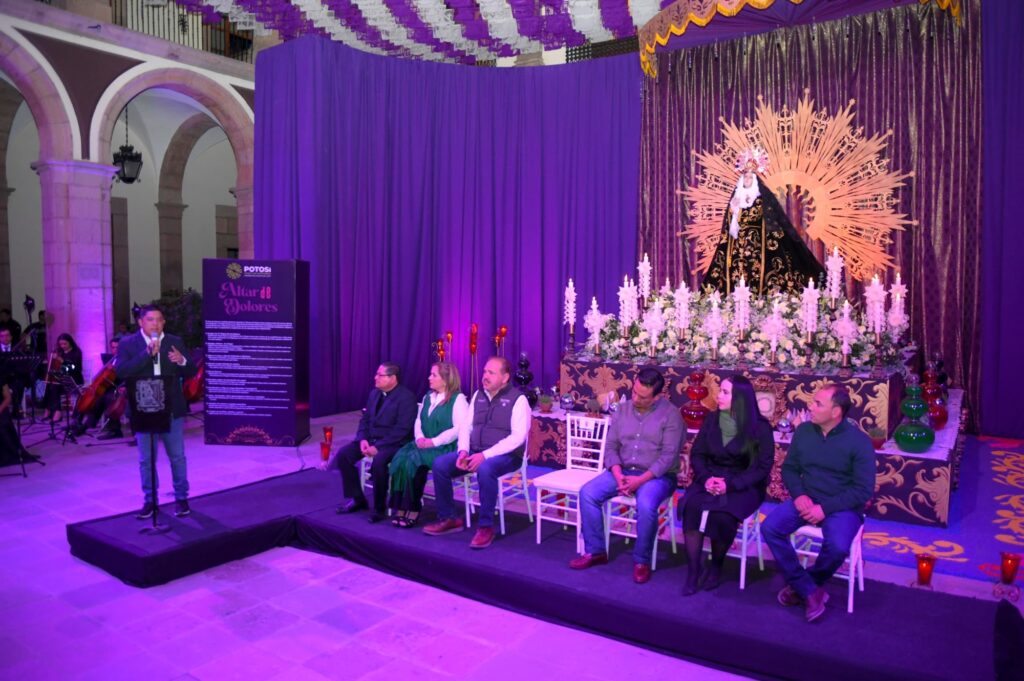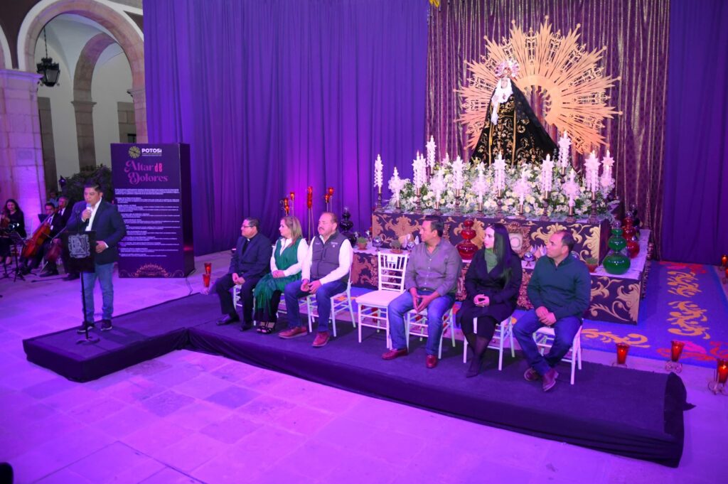 En un emotivo evento, acompañado de autoridades civiles y eclesiales, el Gobernador del Estado, Ricardo Gallardo Cardona, inauguró esta tarde el monumental Altar de Dolores, instalado en el Patio Central de Palacio de Gobierno, con lo que arrancó formalmente las actividades religiosas y culturales que se han preparado con motivo de Semana Santa y Pascua.