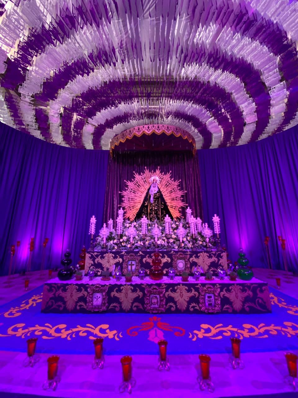 Montada sobre un altar rectangular de dos niveles, la Virgen Dolorosa está rodeada de los principales y tradicionales elementos como las flores, las velas tipo encaje, naranjas doradas, banderines, aguas de colores; los lienzos morados que dominan la representación simbolizan luto y sufrimiento.