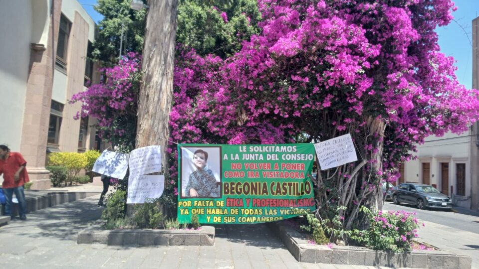 Así lo manifestaron las víctimas José Mario Hernández Bravo y Lourdes Rodríguez Rodríguez, al colocar mantas y pancartas fuera del Congreso del Estado, donde exigían que Begonia Castillo no continúe como visitadora, por “su falta de ética y profesionalismo, ya que habla de todas las victimas y de sus compañeros”.