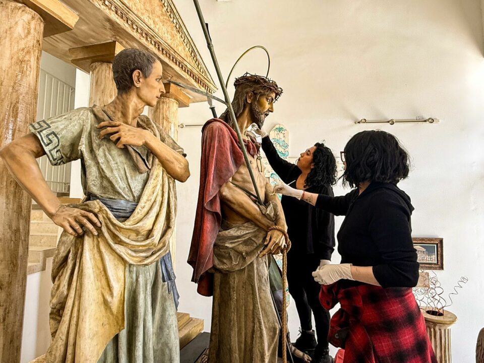 En respuesta a la solicitud de la asociación civil, personal especializado en conservación y restauración de UGCH, realizó trabajos de limpieza y mantenimiento en las imágenes que formarán parte del Viacrucis viviente con el objetivo de asegurar su adecuado estado para el recorrido procesional.