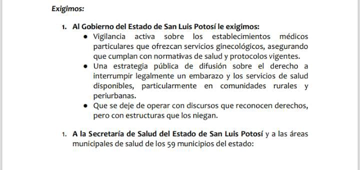Agregan que, a la Secretaría de Salud del Estado de San Luis Potosí y a las áreas municipales de salud de los 59 municipios del estado, les exigen: la inmediata actualización y aplicación obligatoria del Lineamiento Técnico para la Atención del Aborto Seguro en México o la capacitación urgente y obligatoria del personal de salud, especialmente en zonas rurales y urbanas marginadas.