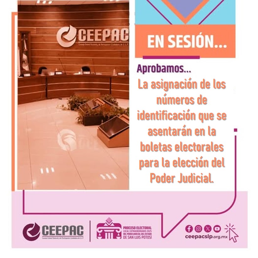 El Consejo General del Consejo Estatal Electoral y de Participación Ciudadana (CEEPAC), en sesión aprobó la asignación de los números de identificación que se asentarán en la boleta electoral para la elección de las candidaturas postuladas en el Proceso Electoral Local Extraordinario 2025, para personas juzgadoras del Poder Judicial del Estado.