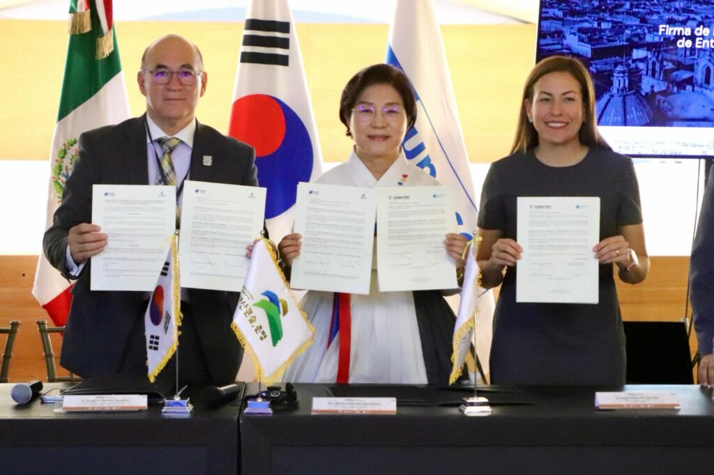Durante la Sesión Plenaria realizada en el Centro de las Artes, la Red de Ciudades del Aprendizaje, presidida por el alcalde de San Luis Potosí, Enrique Galindo Ceballos, formalizó acuerdos de cooperación con autoridades municipales de México y la República de Corea. En el encuentro también participó Raúl Valdés Cotera, coordinador de la Red Mundial de la Unesco.